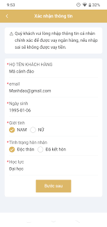 Bước 2: Đăng ký tài khoản bằng cách nhập số điện thoại. Sau đó cấp đủ thông tin cá nhân:họ tên, địa chỉ cư trú, địa chỉ email, công việc, mức lương, số tài khoản ngân hàng…
